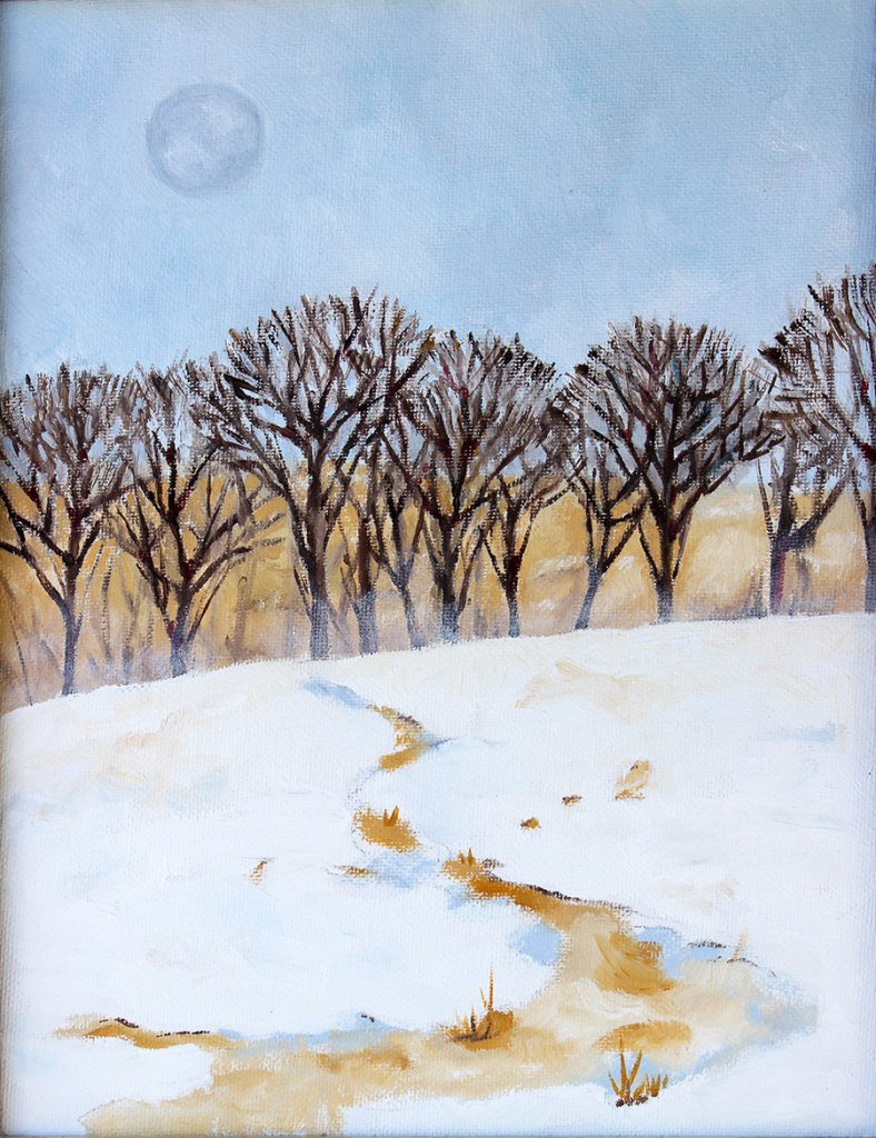 There are many farms in Maryland with rolling green hills most of the year. In the winter, when the snow covers the ground, in between the fields are rows of Oak or Hickory trees grown to slow the wind. In the winter they turn to dark, bare trees against white snow. The cattle and deer walk trails in the snow, exposing golden grass, dead in winter and waiting for spring. This painting was inspired by a light moon in a daylight sky.