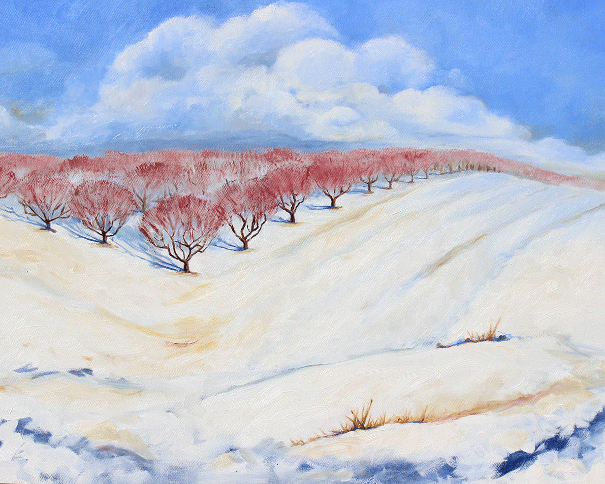 Outside Washington DC there is an apple orchard that has been turned into a Disneyland like experience for city dwellers. It gets very busy during the summer months with cart rides to the apple trees for visitors to pick apples. They have pumpkins in October, and have now added things like a gift shop, animal petting and even a snack bar. But in the winter, for those of us who live nearby, the cold hits and all the traffic and visitors stop coming and we have it to ourselves. A blanket of snow puts down a soft quiet over the landscape, and the apple branches turn this beautiful maroon against the winter blue sky which often has new snow clouds building.