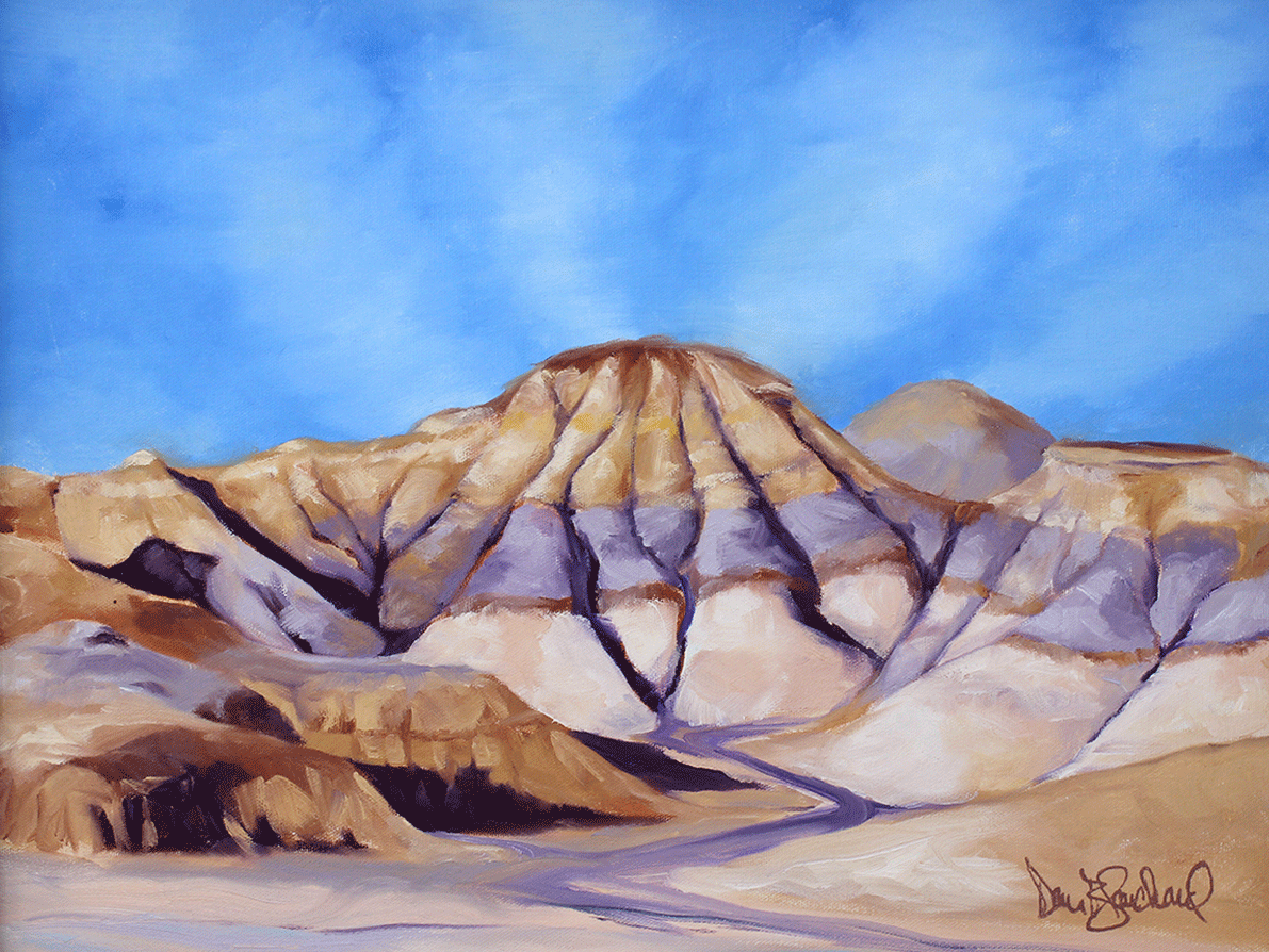 The Chinle formation on the desert in northern Arizona gets it color from ancient minerals in the soil. Petrified wood, fossils, dinosaur footprints all inhabit the mounds of sand and earth, layers upon layers built up over thousands of years. On this day the fan of cirrus clouds in the sky reflected the fan of water carved trenches that is formed naturally by the rain and wind in the hills of the Chinle.